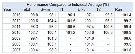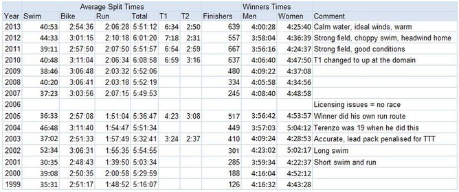 Unfortunately higher temperatures come back to bite you on the run where you are moving slower so don’t get the same cooling effect that you do on the bike. So 2013 was one of the slowest years on record (for repeat competitors).