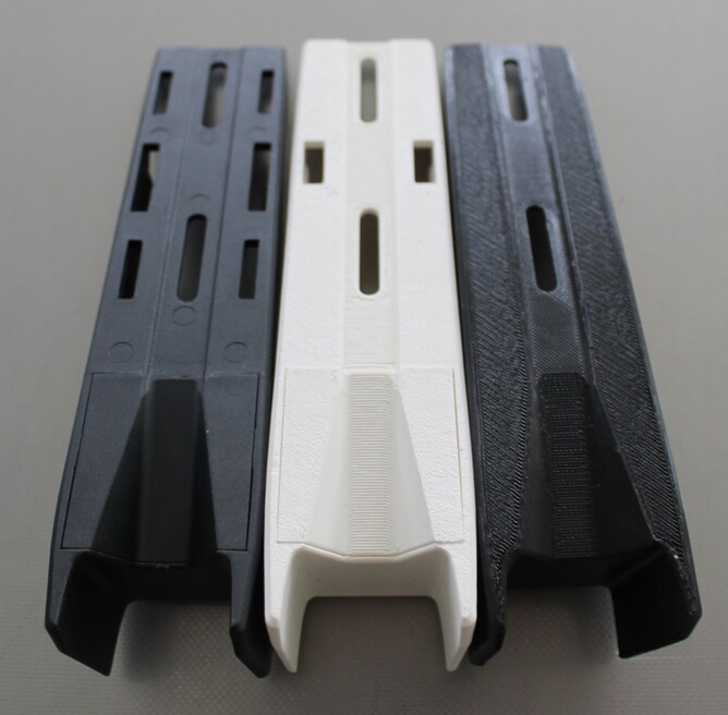 The cage also went through iterations of shape and mounting options. In the final version (at right) the side slots line up with the indents in the base of the flask so that zip ties can be used to attach the cage to bikes that lack bosses.