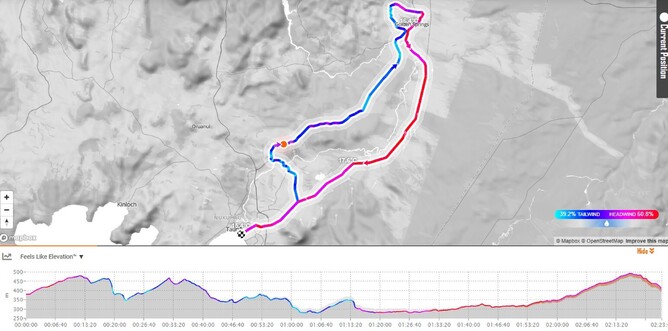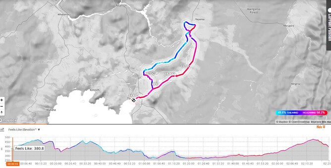 The image above is from mywindsock.com - it shows the wind direction as you go around the course. This is the prevailing wind direction for Taupo and hampers speed the most on this course. Which is explained by the elevation graph - headwind and false flat/uphill together tend to knock your pace a bit.