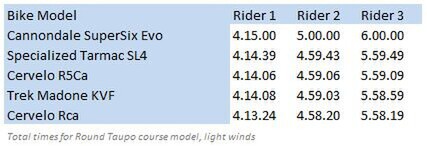 If we profile 4.15, 5.00 and 6.00 hour riders the different bikes would yield the following times:
