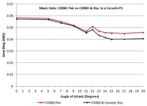 The chart I found most interesting compares the CXR80 pair in a Cervelo P5 to the same bike with a Comete Disc replacing the rear CXR80. You can see on their chart (snipped from bikeradar) that the performance gap between those options is quite small.