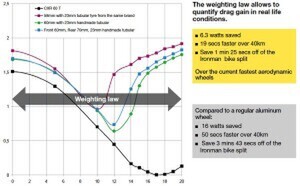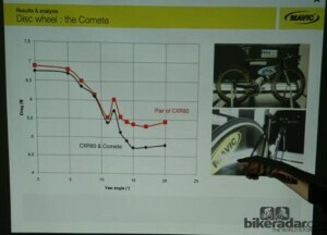 Apart from all that interesting data Mavic of course produced pretty graphs showing how much better their new wheels are than everyone else. What is annoying is that they don’t include testing of the CXR60 without the CX01 strip (the aero blade) – not legal for races under UCI rules and I suspect too much of a hassle for many triathletes.