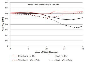 Taking this data and normalising for the same start point bears that statement out fairly well – the divergence in the drag may happen a little earlier when on the bike (in favour of Mavic) though it is hard to tell when they didn’t use the same angles for each test.