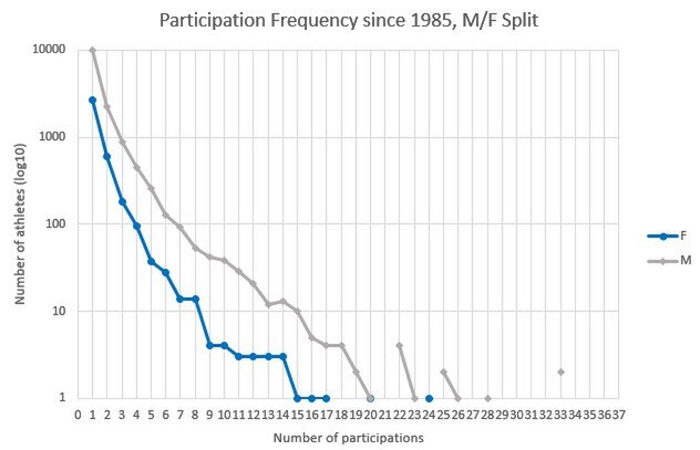 That's 14,559 out of 19,854* athletes who've competed once. Much of which is explained by being a destination race of course.