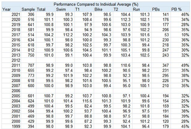 I don't know whether this reflects the popularisation of Ironman in recent years, or a commentary on coaching and equipment choices. It certainly runs counter to the trend of the Elite athletes and course modifications.