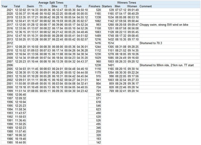 A much lower number of competitors this year, thanks to excluding the rest of the world from being able to travel to NZ. In this table the improvement in overall average time appears to have come from the bike and run legs.